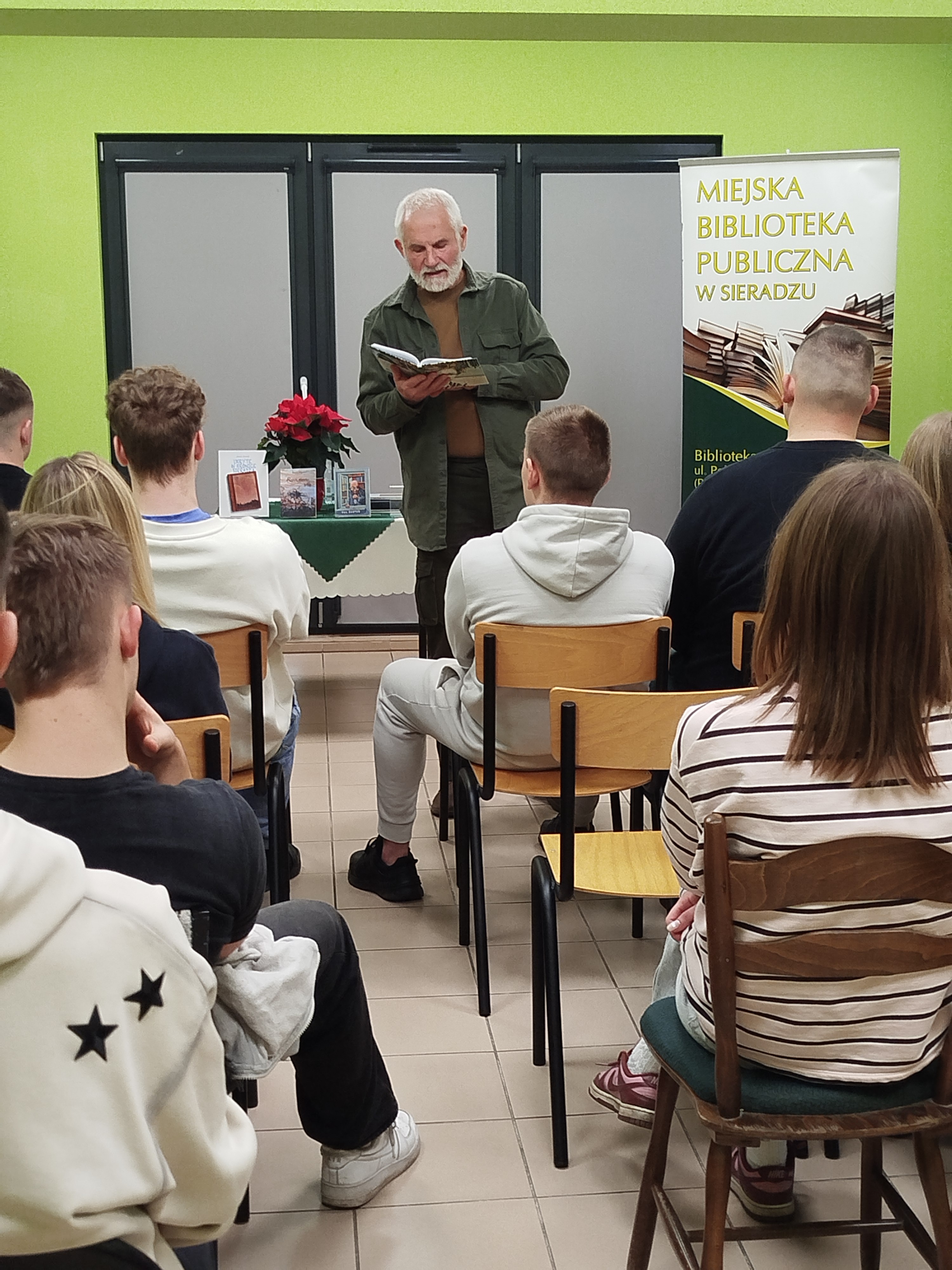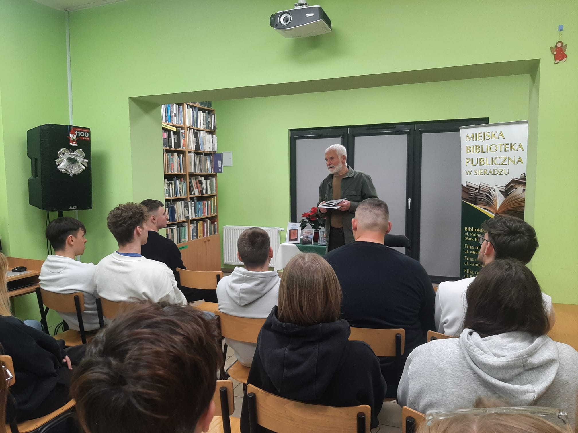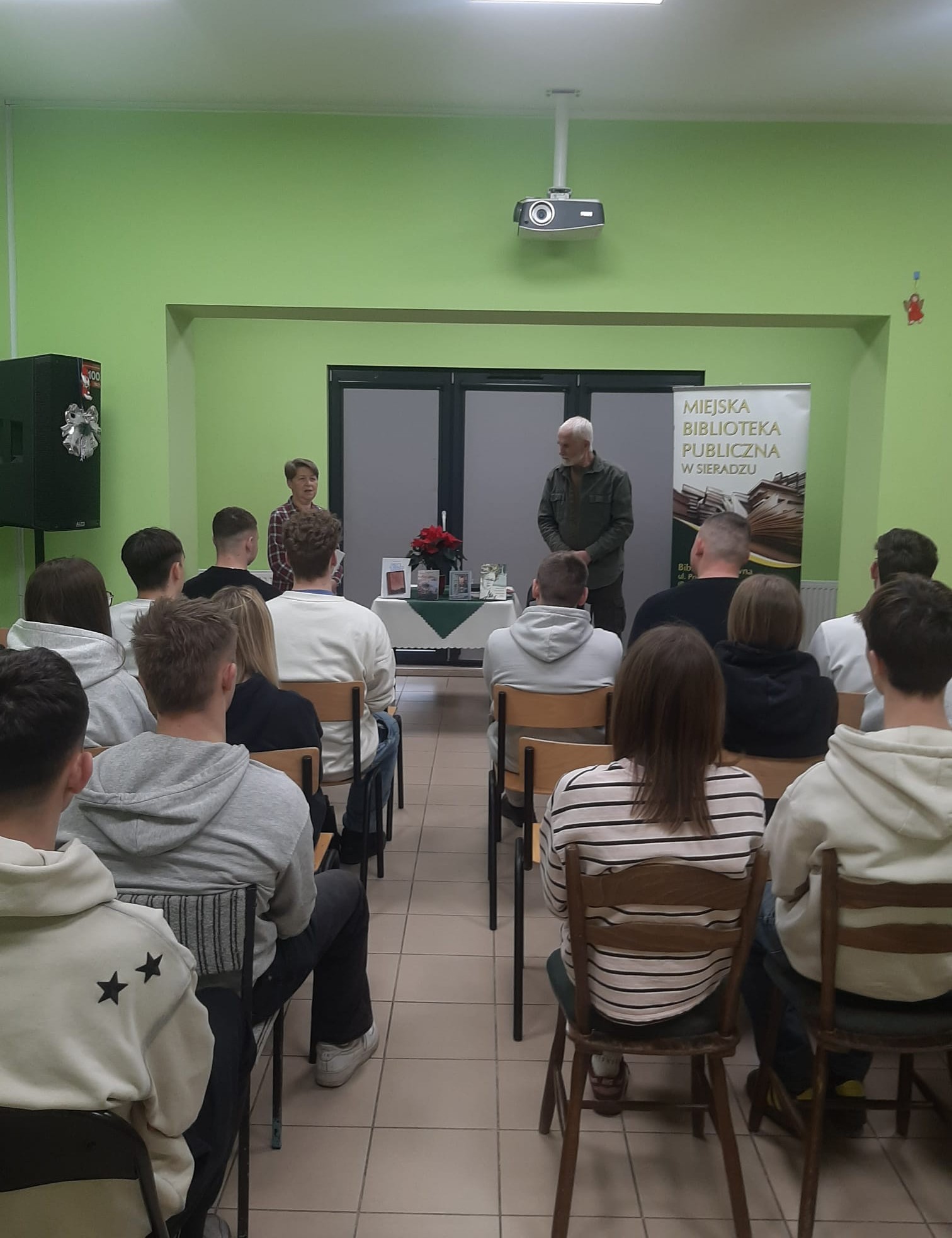 17. grudnia w Bibliotece Głównej odbyło się spotkanie autorskie z Januszem Ziarnikiem – regionalistą, krajoznawcą, pedagogiem, autorem książek i artykułów w kwartalniku „Na Sieradzkich Szlakach”. W spotkaniu uczestniczyli maturzyści z Powiatowego Zespołu Szkół nr 1. Autor opowiadał o swoich książkach, zainteresowaniach regionem i spostrzeżeniach na temat otaczającego nas świata. Sporo miejsca poświęcone zostało książce „Ukryte w kronice Sieradza”, z której możemy dowiedzieć się wielu ciekawych informacji o historii naszego miasta. Uczniowie, którzy kształcą się w klasie o profilu architektura krajobrazu byli zainteresowania też pasjami przyrodniczymi i krajoznawczymi prelegenta.