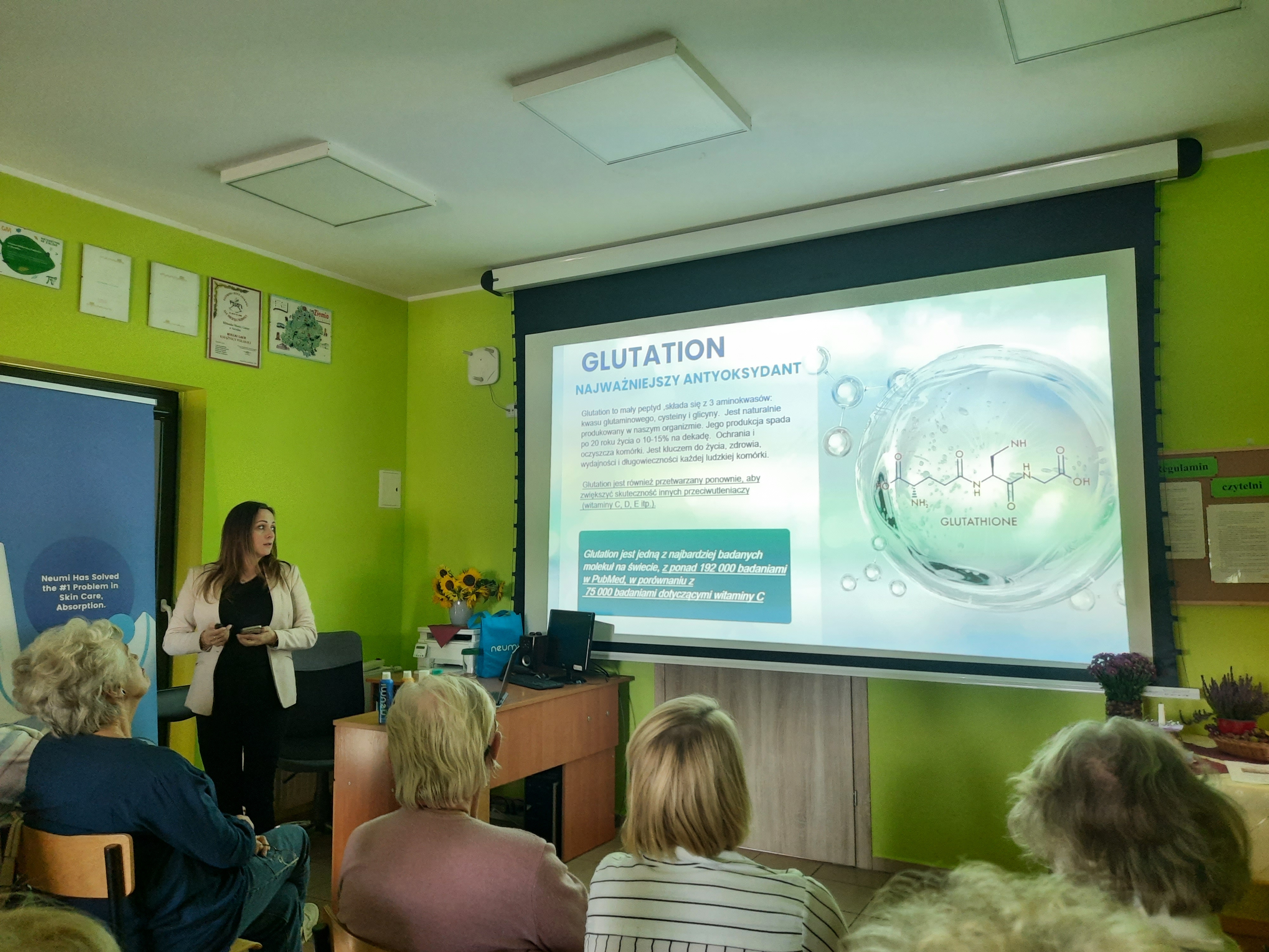 W dniu 26 września 2025 roku odbył się w Bibliotece Głównej MBP w Sieradzu wykład pani Anity Zapały, naturoterapeutki, zajmującej się badaniem wpływu glutationu na zdrowie człowieka. Glutation to najsilniejszy antyoksydant produkowany przez ludzki organizm. Działa jako główny przeciwutleniacz, chroniąc komórki przed uszkodzeniami wywołanymi przez wolne rodniki, wspiera proces detoksykacji oraz wzmacnia układ odpornościowy. Podczas spotkania mieliśmy okazję dowiedzieć się, w jaki sposób możemy wspomagać nasze zdrowie, a także wymienić się doświadczeniami i spostrzeżeniami, co dodatkowo wzbogaciło całe wydarzenie.