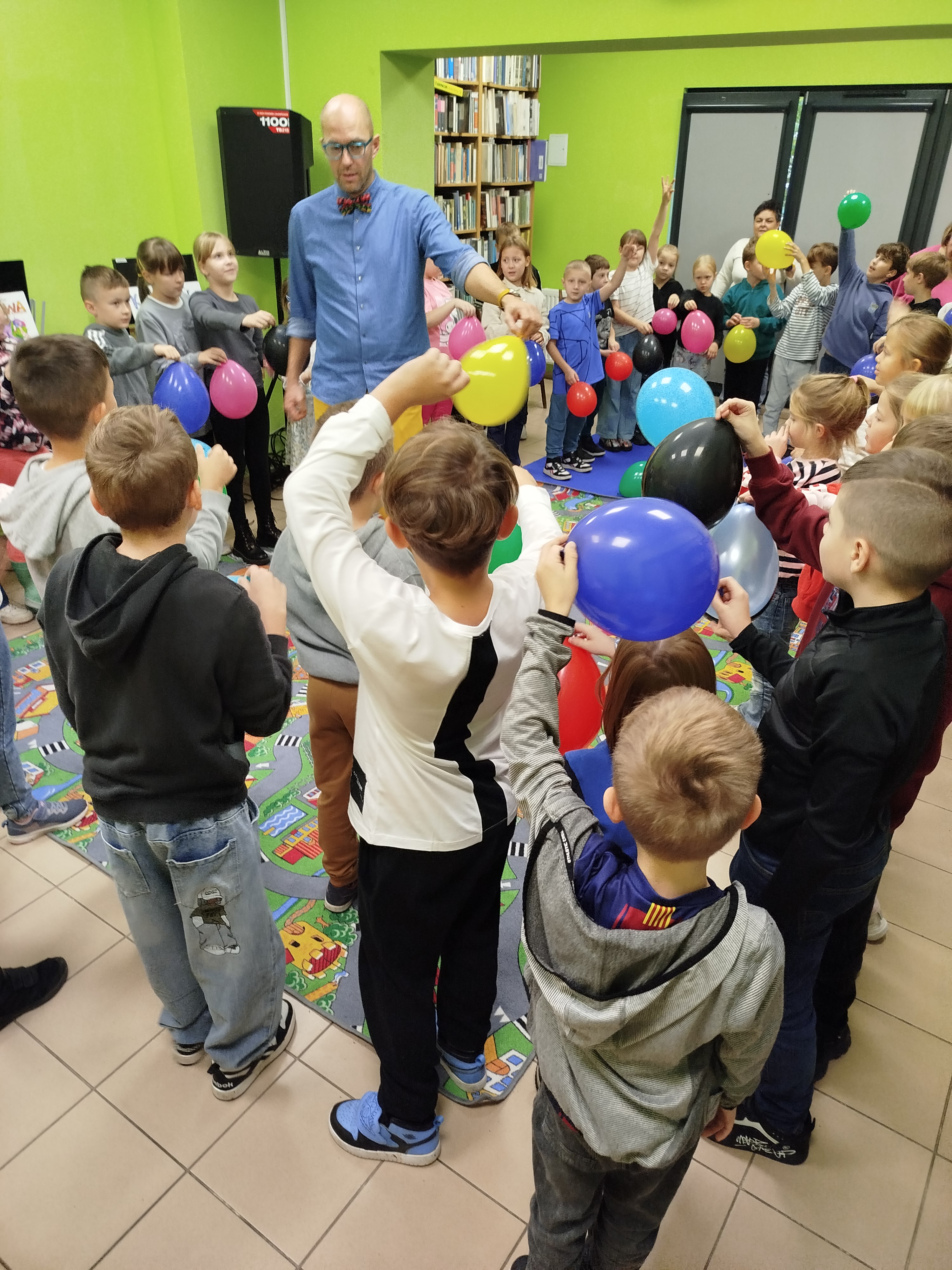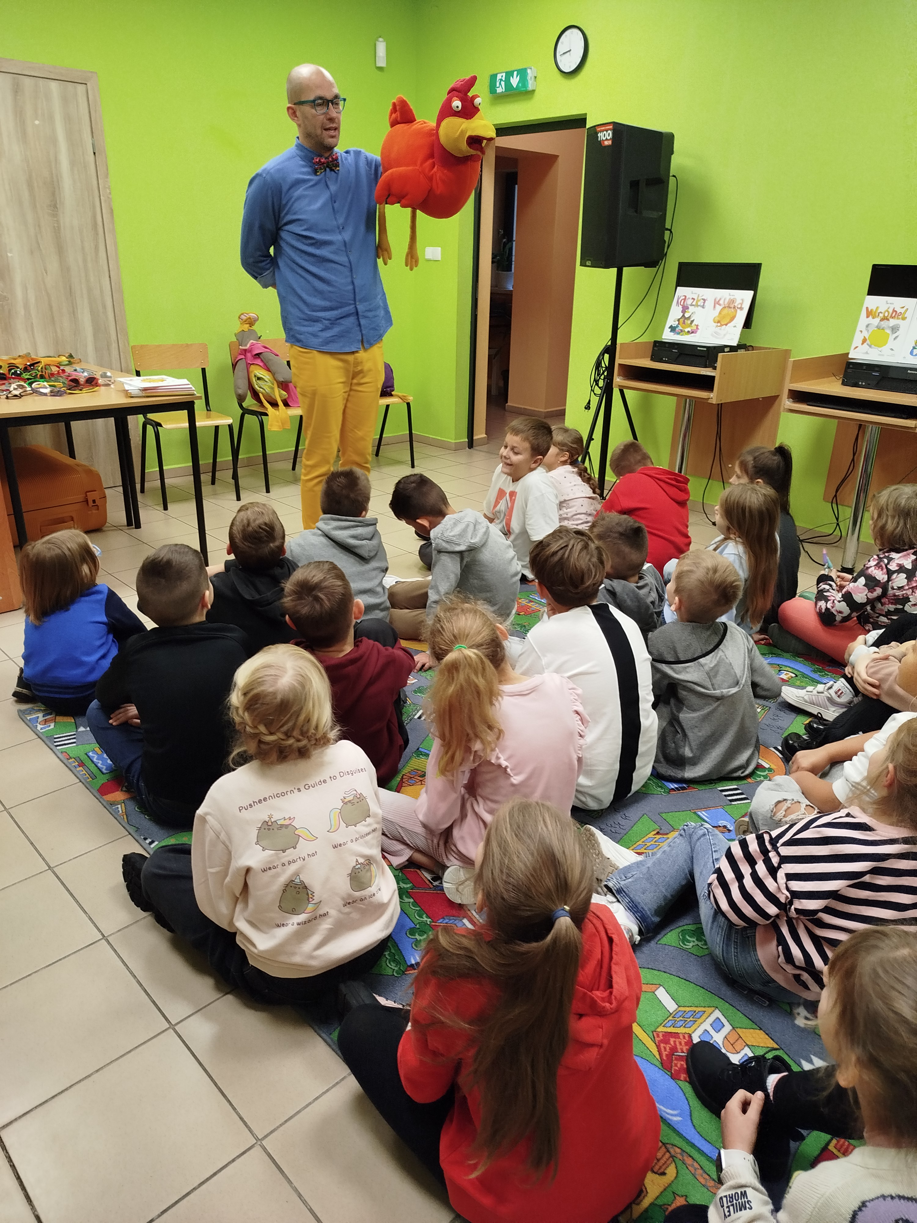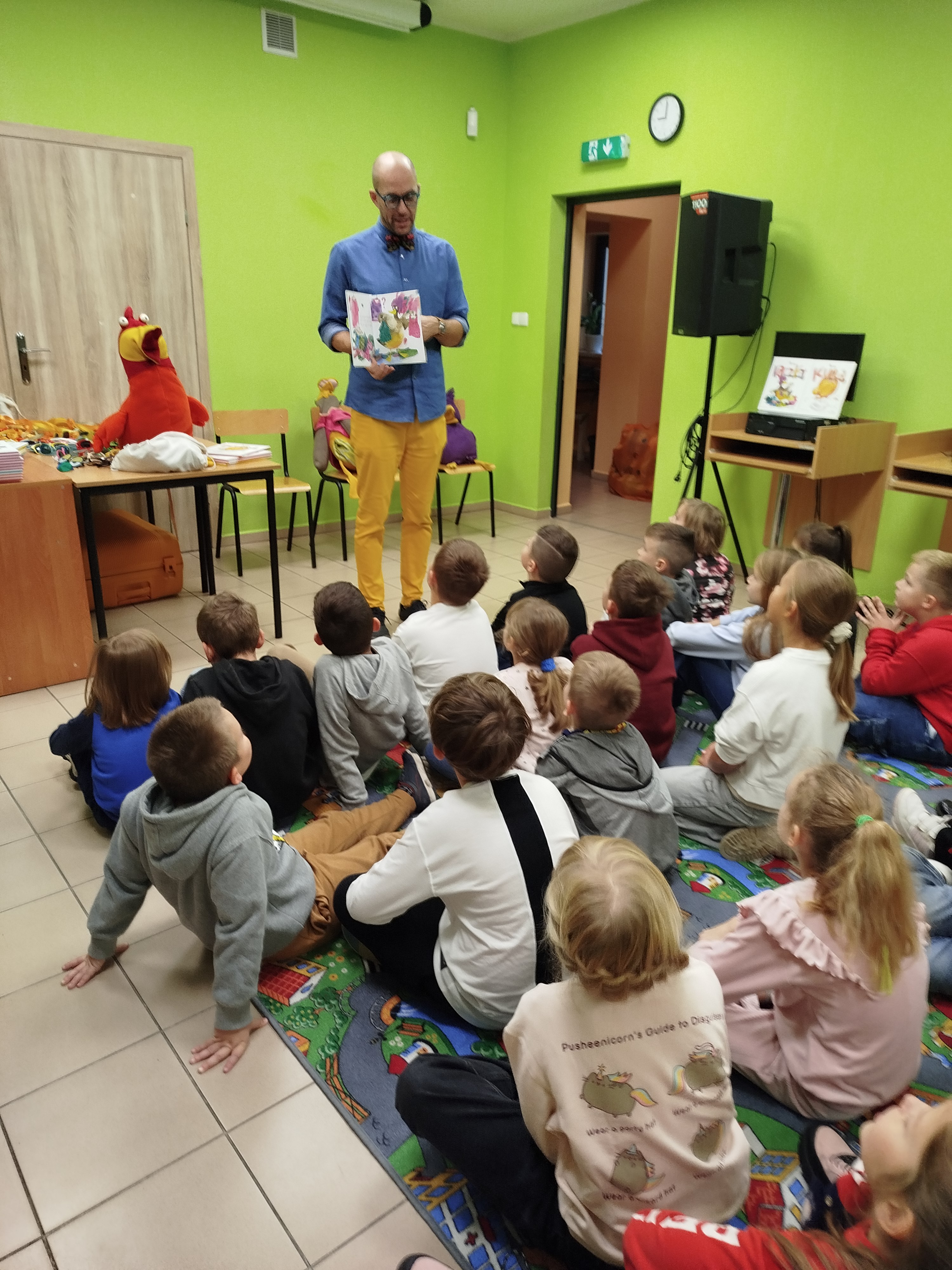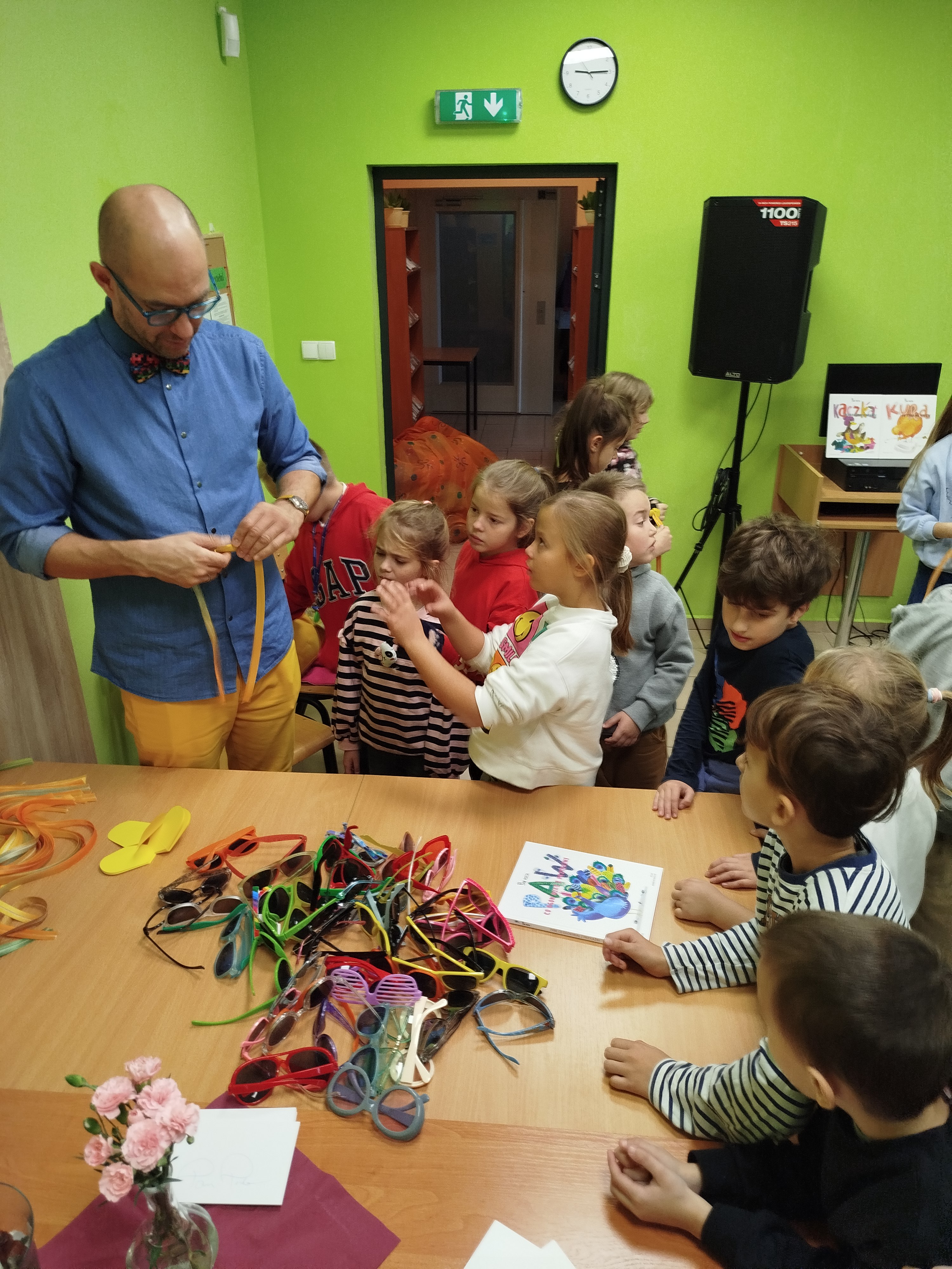Gościem Biblioteki Głównej był Pan Poeta, który spotkał się z uczniami klas drugich ze Szkoły Podstawowej nr 10. Dzieci miały okazję poznać pięknie ilustrowane, kolorowe książki „Kura co tyła na diecie” i „Kaczka co przebrała miarkę”. Było przy tych rymach dużo śmiechu i fantastycznej zabawy. Dzięki rekwizytom przywiezionym przez Autora uczestnicy spotkania mogli m. in. nakarmić wielką kurę zdrowymi przekąskami, posłuchać szumu wzburzonego morza czy wyrzucić w niebo kometę. Dużą atrakcją była też sesja zdjęciowa w kolorowych okularach. Na zakończenie spotkania w zakupionych książkach Autor wpisywał imienne dedykacje.