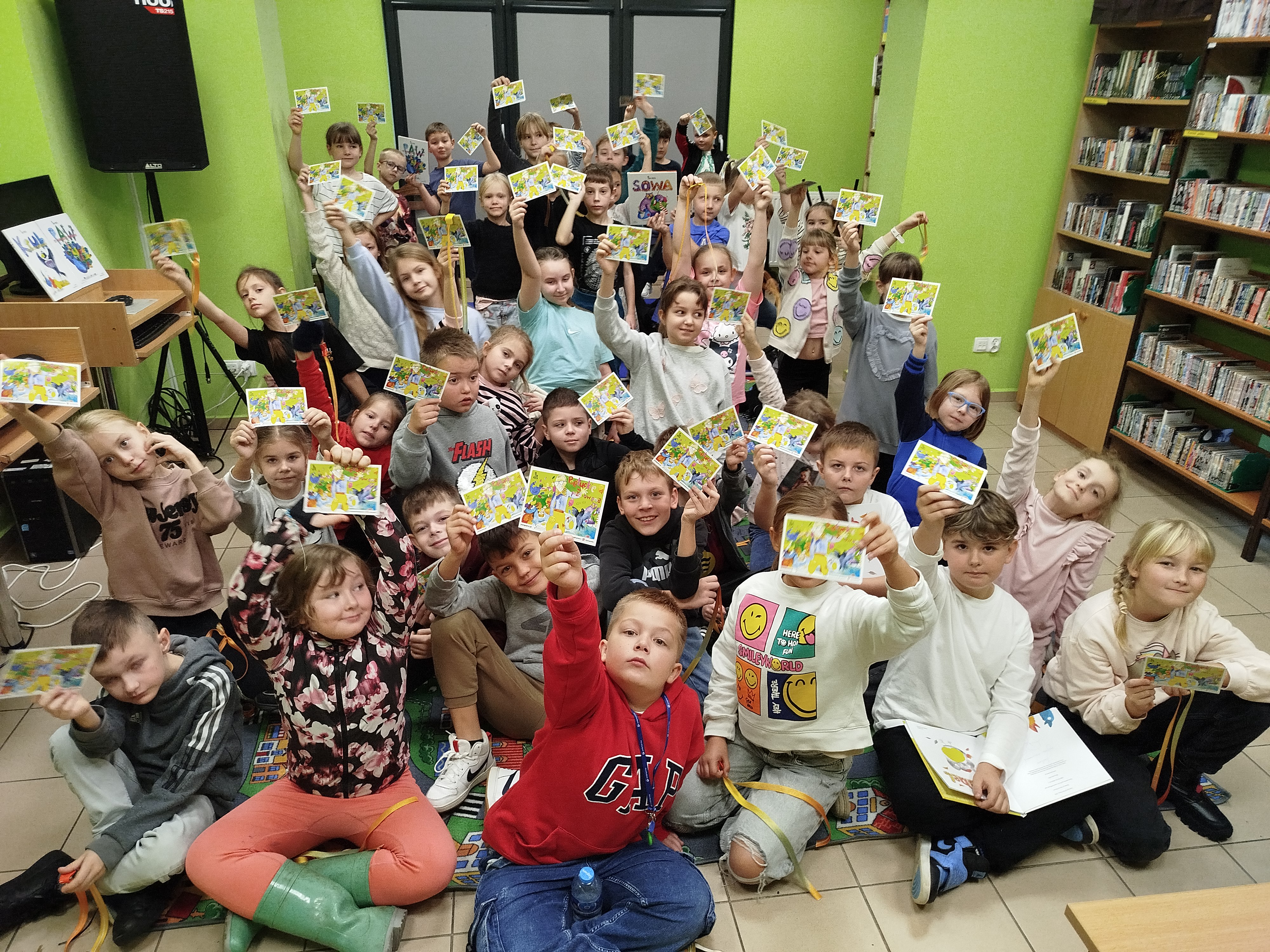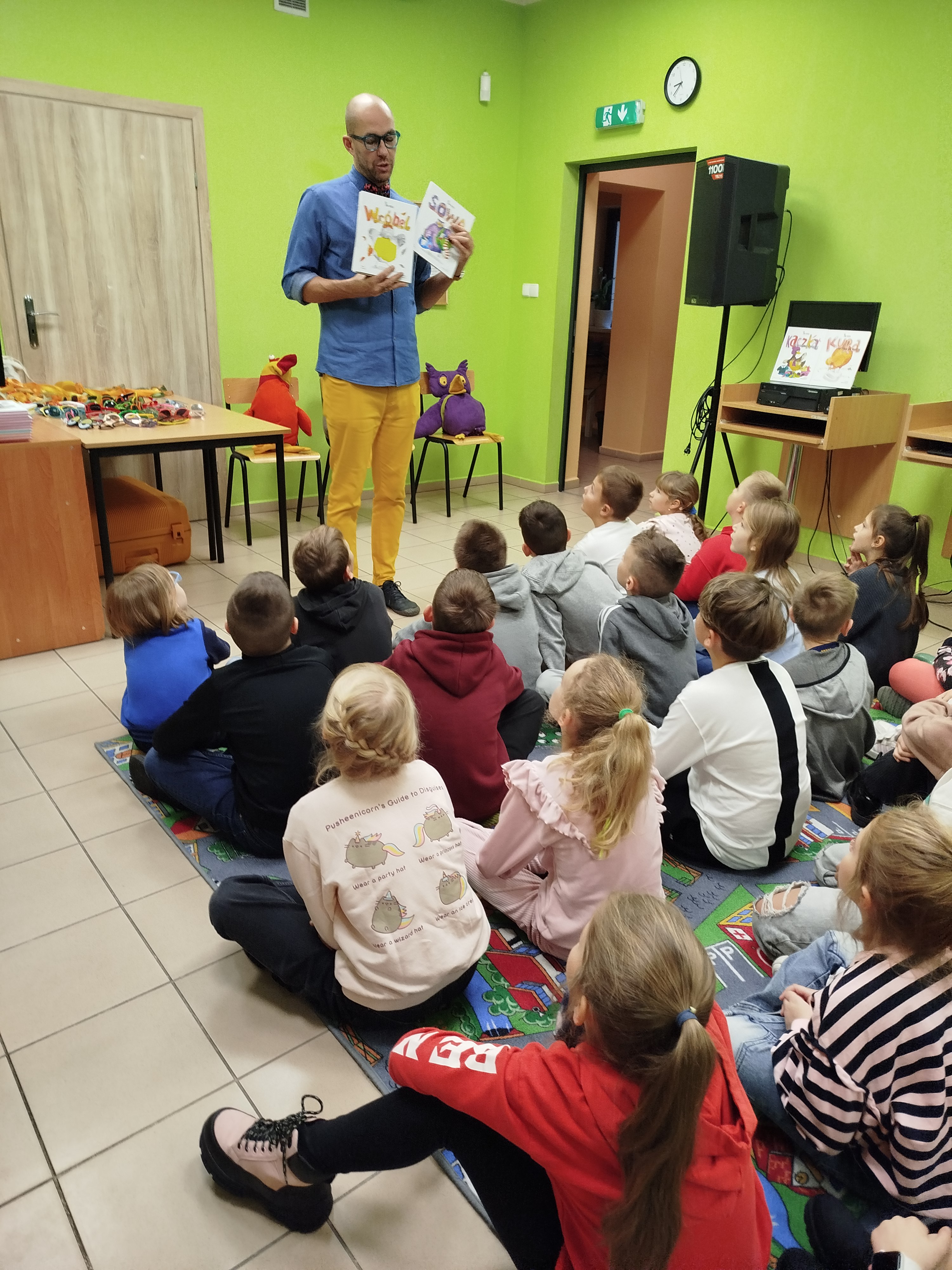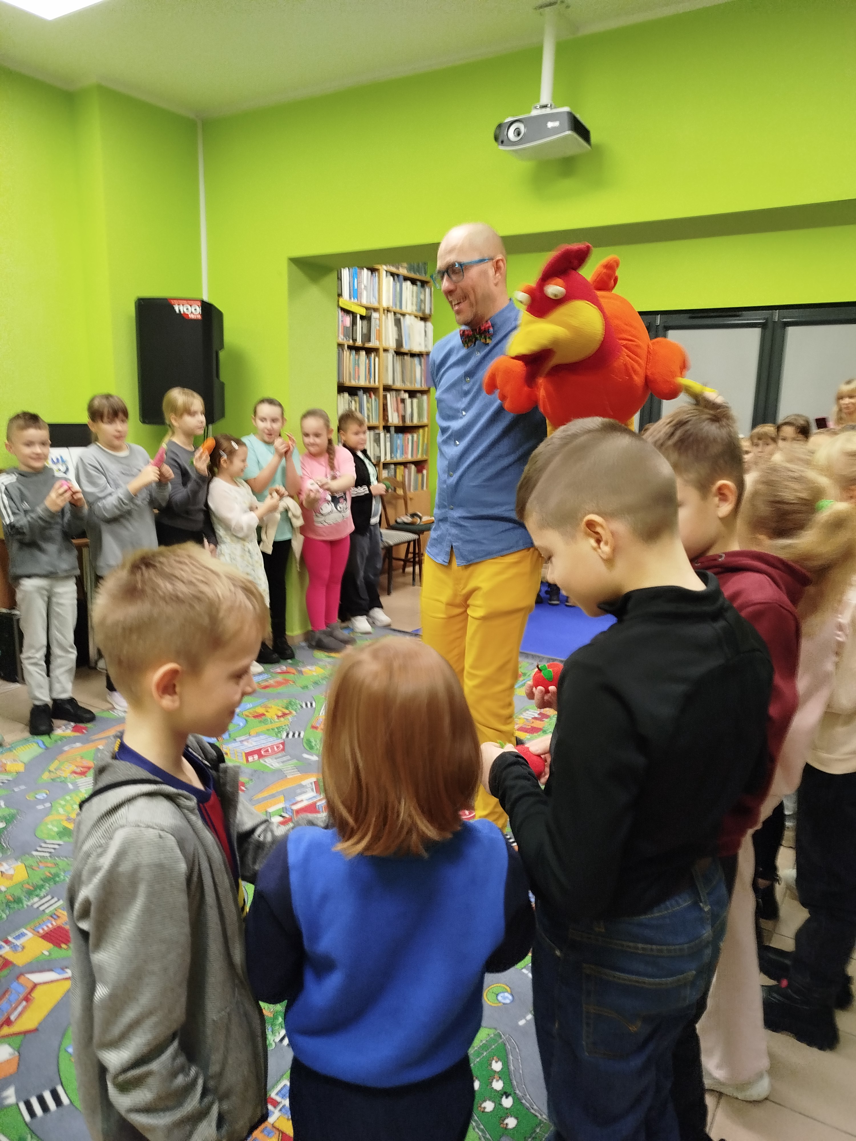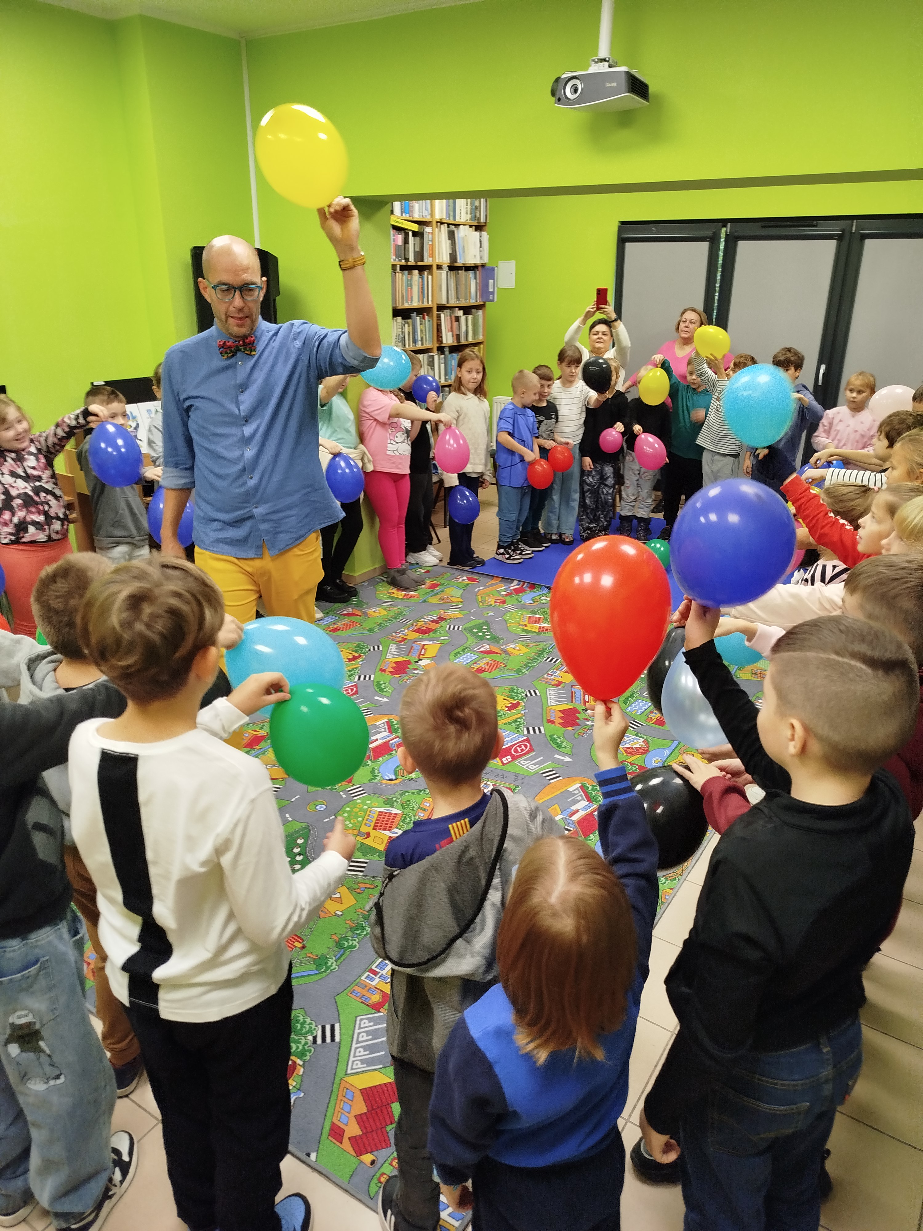 Gościem Biblioteki Głównej był Pan Poeta, który spotkał się z uczniami klas drugich ze Szkoły Podstawowej nr 10. Dzieci miały okazję poznać pięknie ilustrowane, kolorowe książki „Kura co tyła na diecie” i „Kaczka co przebrała miarkę”. Było przy tych rymach dużo śmiechu i fantastycznej zabawy. Dzięki rekwizytom przywiezionym przez Autora uczestnicy spotkania mogli m. in. nakarmić wielką kurę zdrowymi przekąskami, posłuchać szumu wzburzonego morza czy wyrzucić w niebo kometę. Dużą atrakcją była też sesja zdjęciowa w kolorowych okularach. Na zakończenie spotkania w zakupionych książkach Autor wpisywał imienne dedykacje.