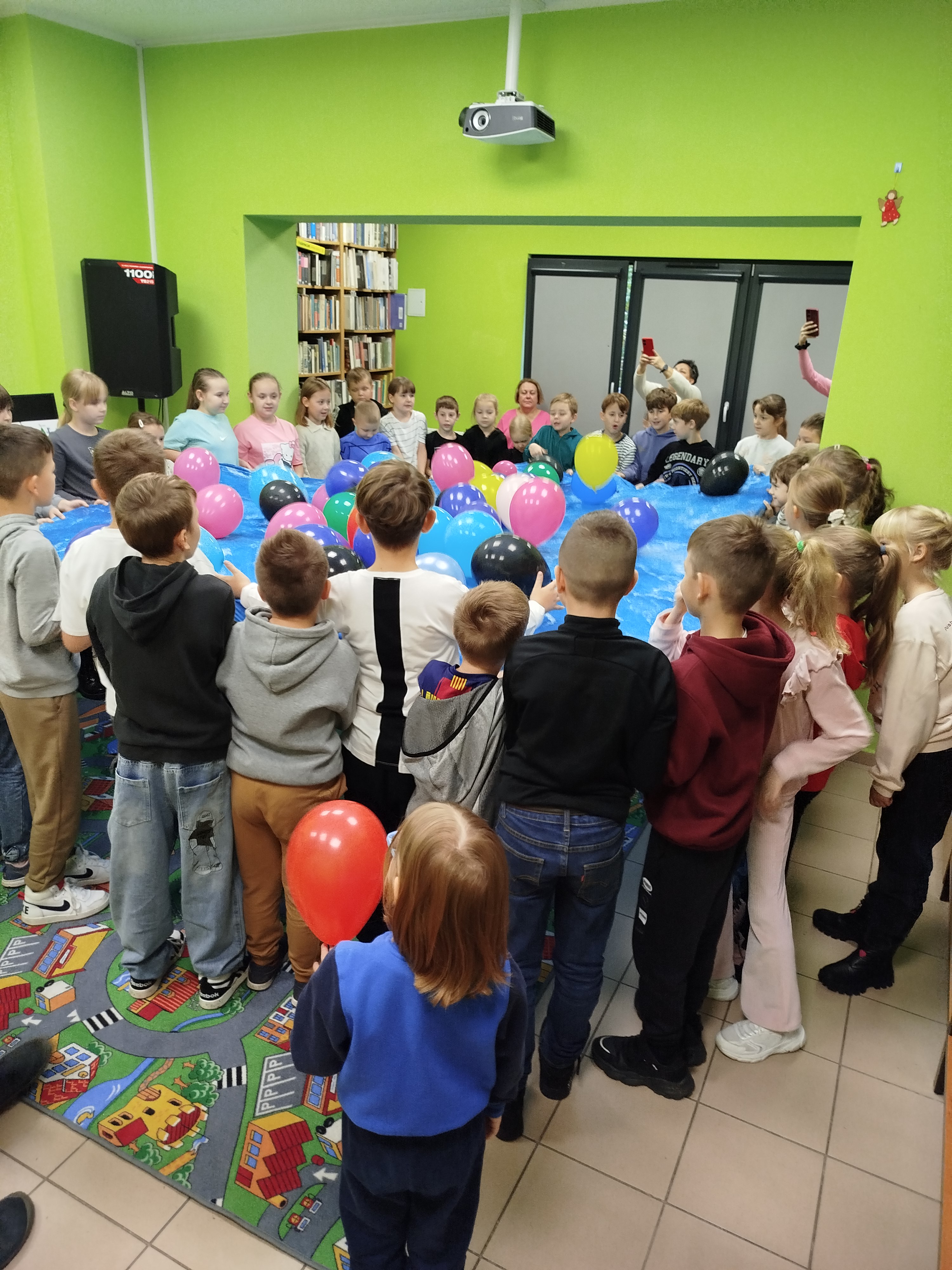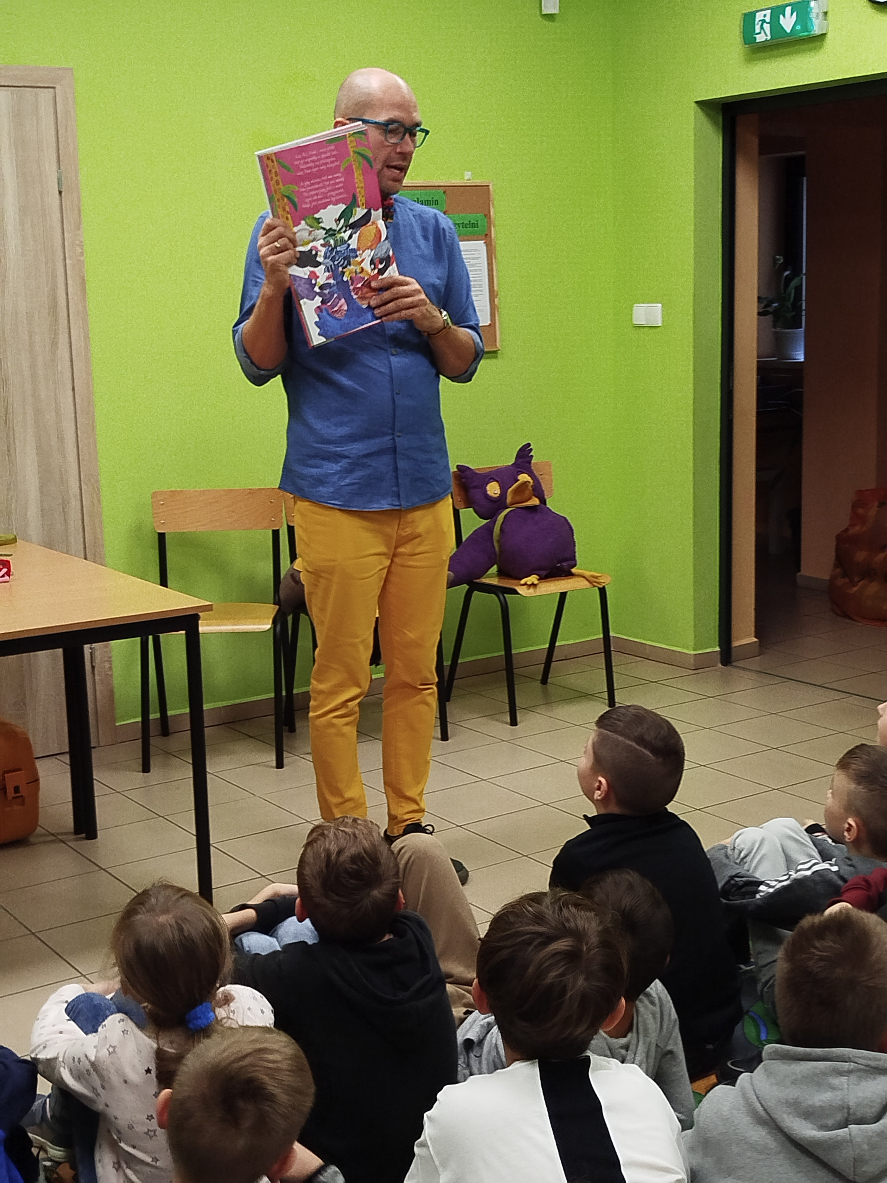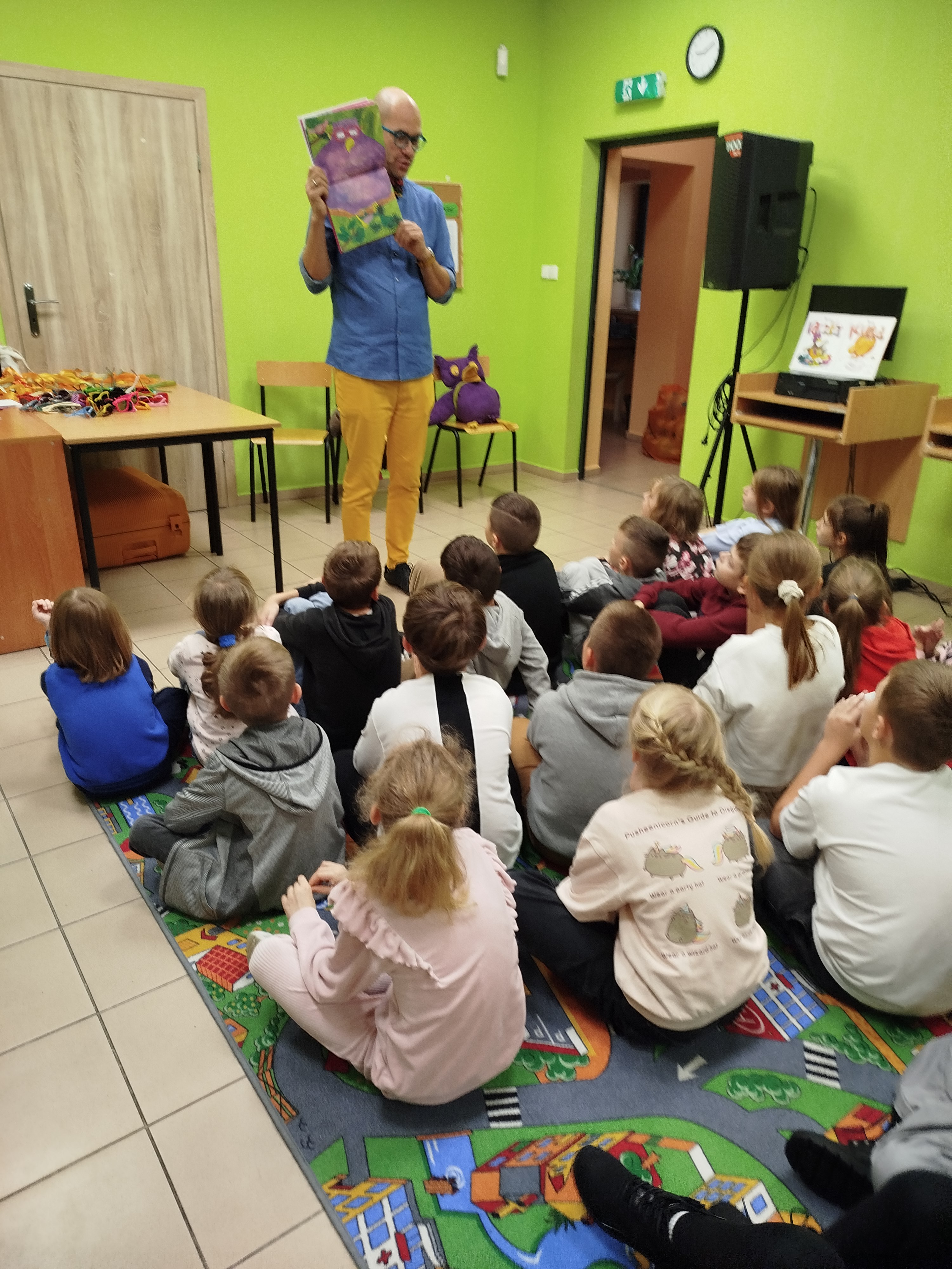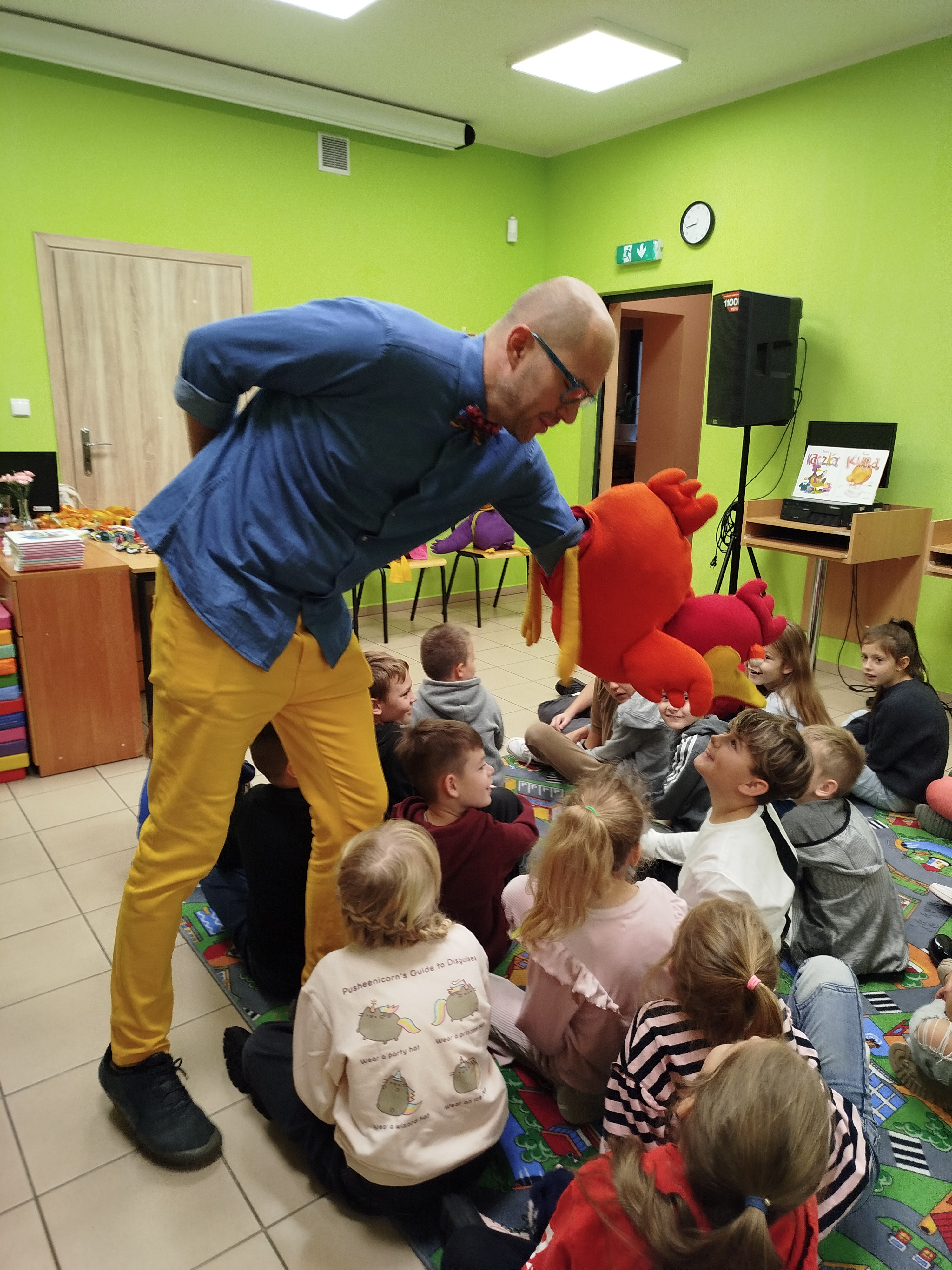 Gościem Biblioteki Głównej był Pan Poeta, który spotkał się z uczniami klas drugich ze Szkoły Podstawowej nr 10. Dzieci miały okazję poznać pięknie ilustrowane, kolorowe książki „Kura co tyła na diecie” i „Kaczka co przebrała miarkę”. Było przy tych rymach dużo śmiechu i fantastycznej zabawy. Dzięki rekwizytom przywiezionym przez Autora uczestnicy spotkania mogli m. in. nakarmić wielką kurę zdrowymi przekąskami, posłuchać szumu wzburzonego morza czy wyrzucić w niebo kometę. Dużą atrakcją była też sesja zdjęciowa w kolorowych okularach. Na zakończenie spotkania w zakupionych książkach Autor wpisywał imienne dedykacje.